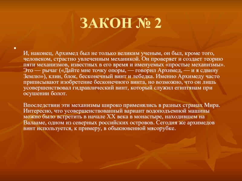 был, кроме того, человеком, страстно увлеченным механикой. Он проверяет и создает теорию пяти механизмов, известных в его время и именуемых «простые механизмы». Это — рычаг («Дайте мне точку опоры, — говорил Архимед, — и я сдвину Землю»), клин, блок, бесконечный винт и лебедка. Именно Архимеду часто приписывают изобретение бесконечного винта, но возможно, что он лишь усовершенствовал гидравлический винт, который служил египтянам при осушении болот.