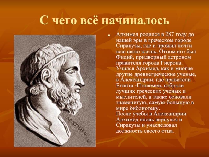 в греческом городе Сиракузы, где и прожил почти всю свою жизнь. Отцом его был Фидий, придворный астроном правителя города Гиерона. Учился Архимед, как и многие другие древнегреческие ученые, в Александрии, где правители Египта -Птолемеи, собрали лучших греческих ученых и мыслителей, а также основали знаменитую, самую большую в мире библиотеку.