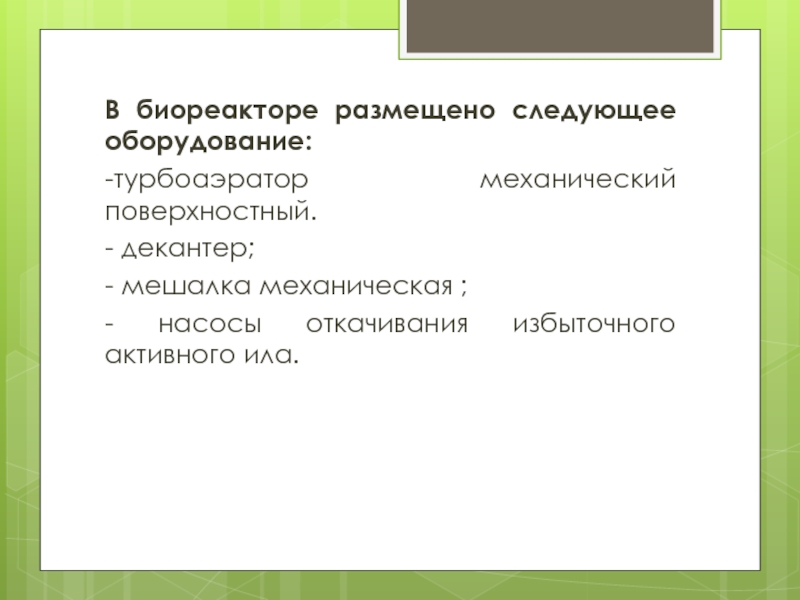деканторов. Декантор забирает чистую воду из верхнего слоя отстоянной воды и водит её из биореактора.