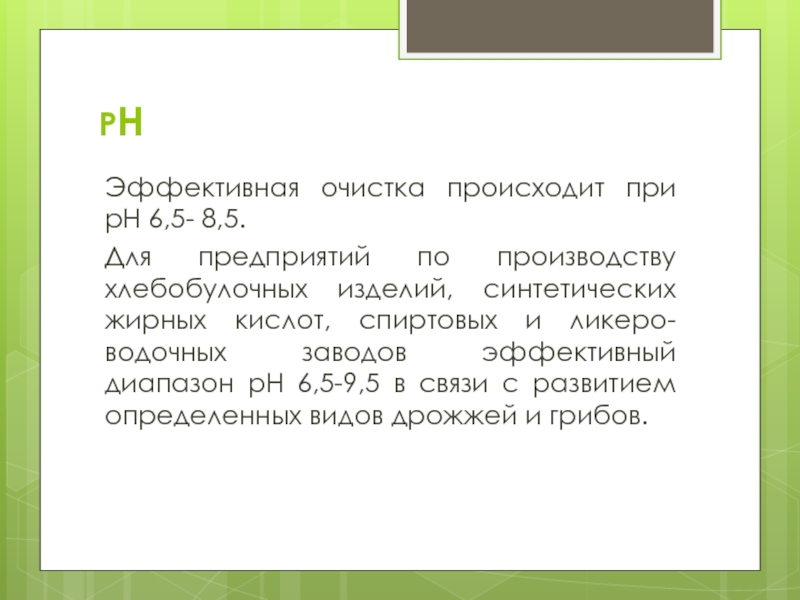 изделий, синтетических жирных кислот, спиртовых и ликеро-водочных заводов эффективный диапазон рН 6,5-9,5 в связи с развитием определенных видов дрожжей и грибов.