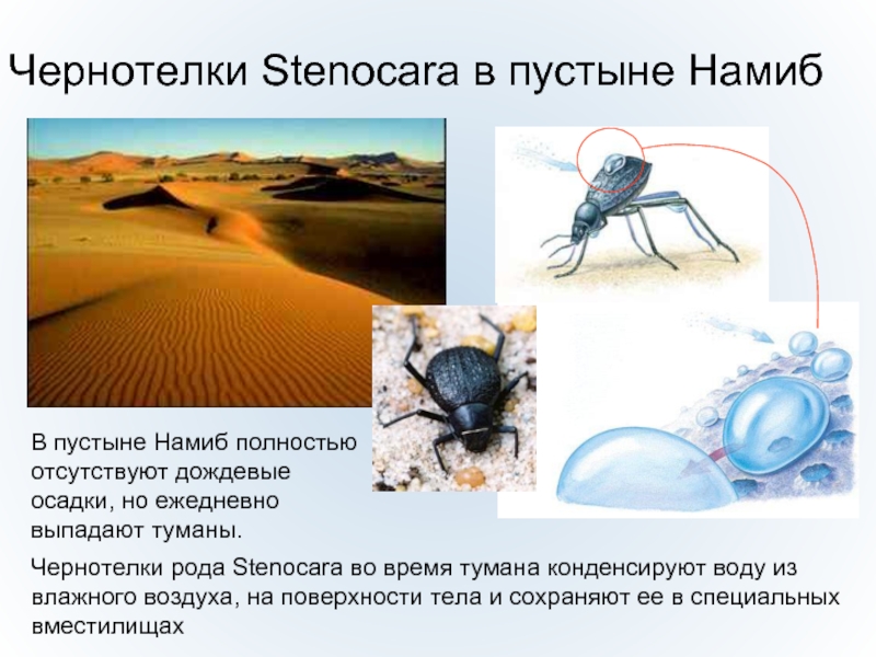 Чернотелки рода Stenocara во время тумана конденсируют воду из влажного воздуха, на поверхности тела и сохраняют ее в специальных вместилищах