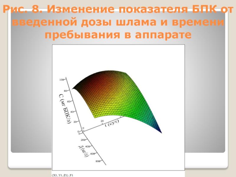Слайд 11Рис. 8. Изменение показателя БПК от введенной дозы шлама и времени