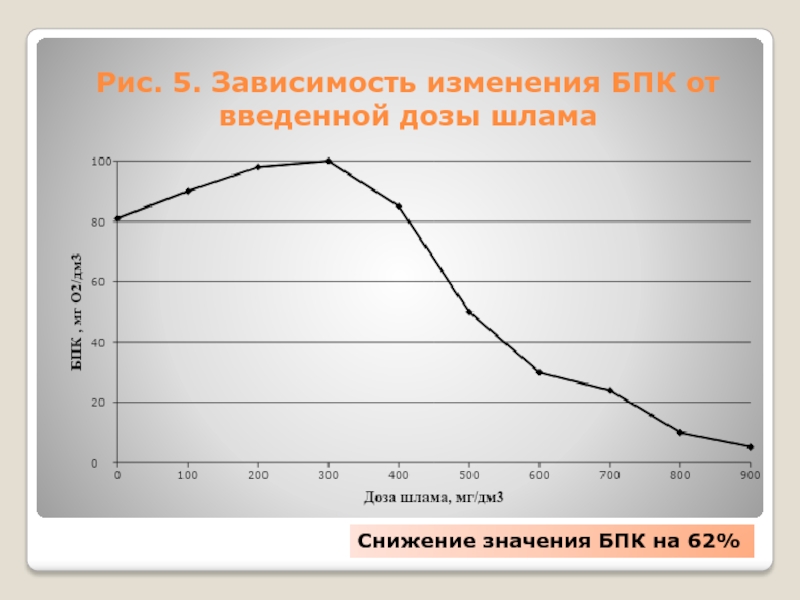 Слайд 7 Рис. 5. Зависимость изменения БПК от введенной дозы шлама