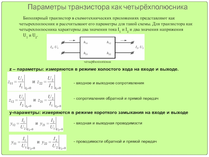 z – параметры: измеряются в режиме холостого хода на входе и выходе.