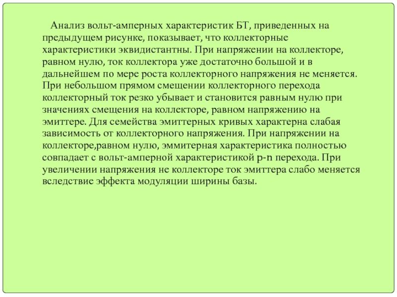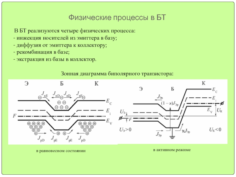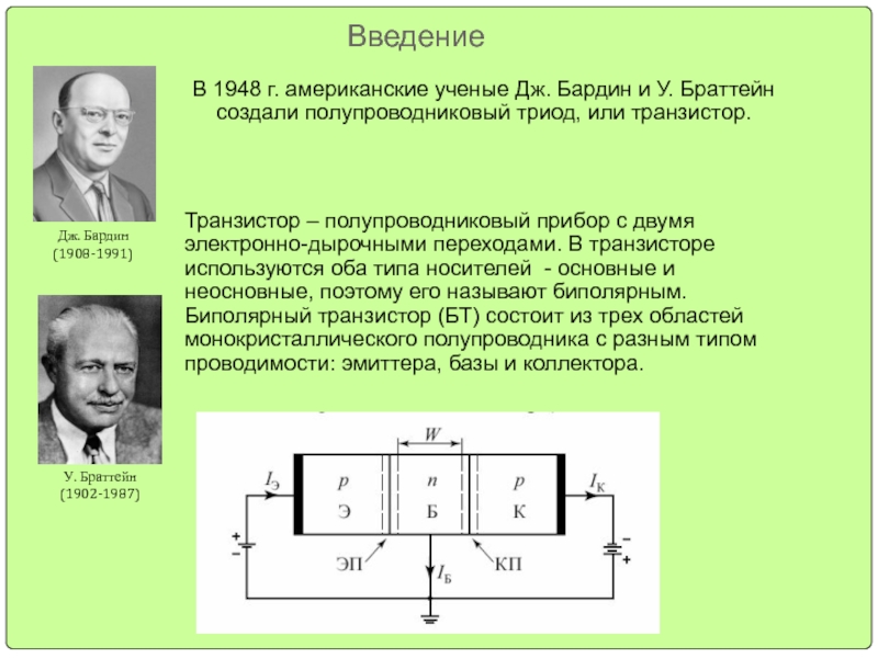 Транзистор – полупроводниковый прибор с двумя электронно-дырочными переходами. В транзисторе используются оба типа носителей - основные и неосновные, поэтому его называют биполярным. Биполярный транзистор (БТ) состоит из трех областей монокристаллического полупроводника с разным типом проводимости: эмиттера, базы и коллектора.
