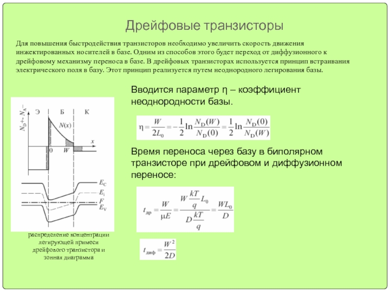 Время переноса через базу в биполярном транзисторе при дрейфовом и диффузионном переносе:
