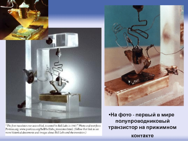 Слайд 5На фото - первый в мире полупроводниковый транзистор на прижимном контакте