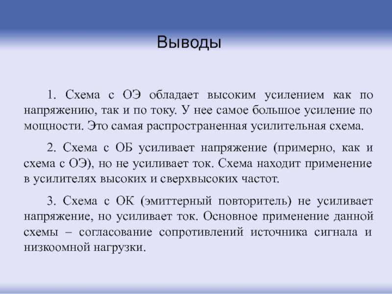 Слайд 611. Схема с ОЭ обладает высоким усилением как по напряжению, так