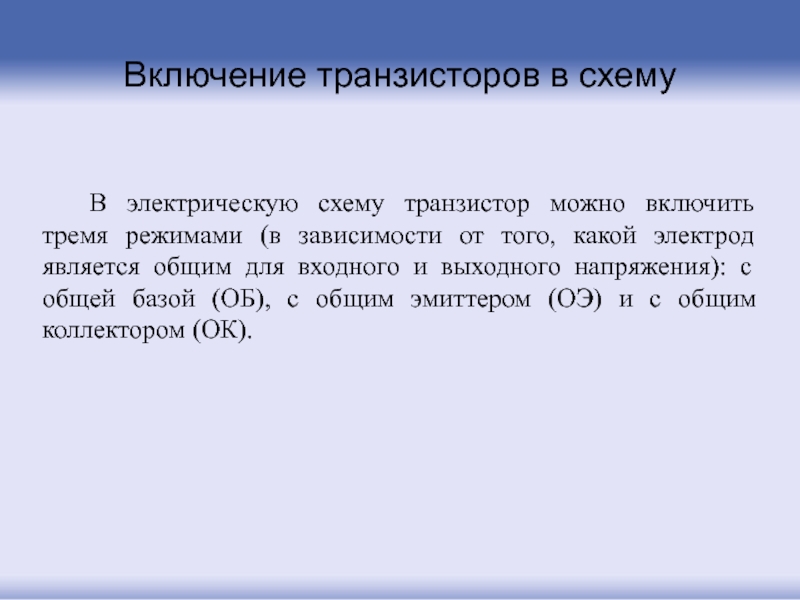 того, какой электрод является общим для входного и выходного напряжения): с общей базой (ОБ), с общим эмиттером (ОЭ) и с общим коллектором (ОК).