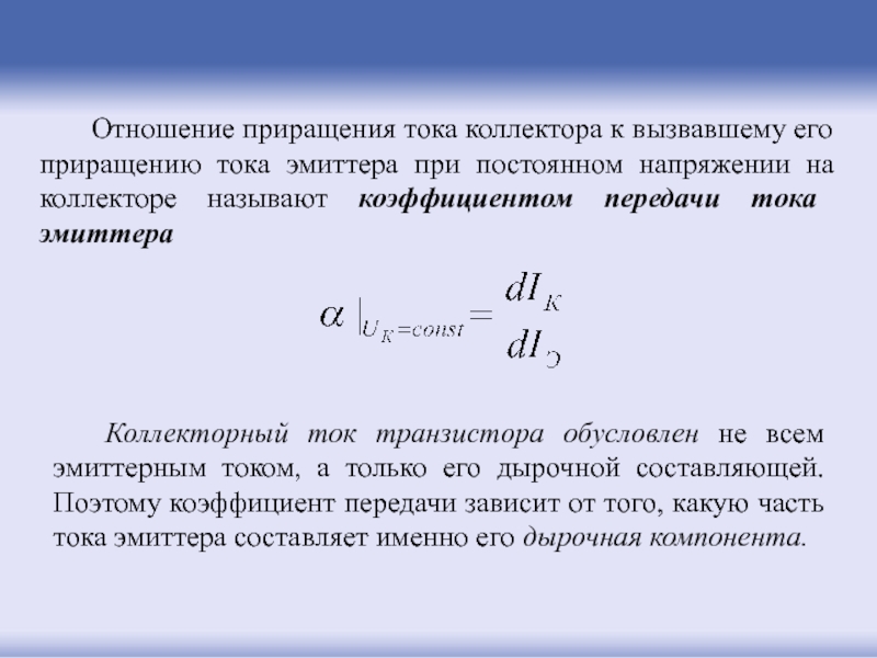 Слайд 22Отношение приращения тока коллектора к вызвавшему его приращению тока эмиттера при