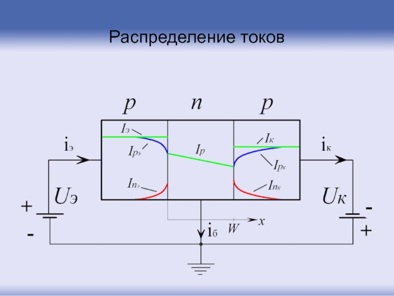 Определим характер распределения неосновных носителей и токов в областях базы, эмиттера и коллектора транзистора .