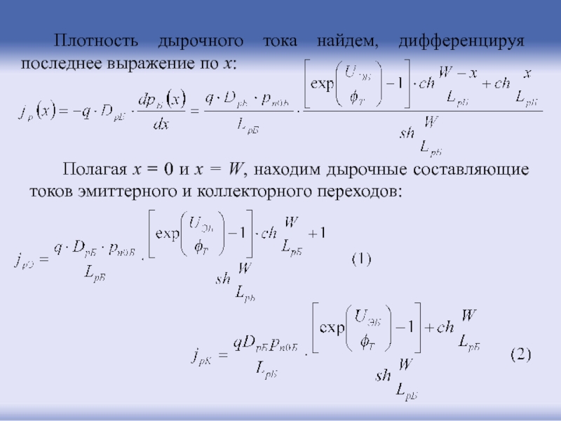 Слайд 30Плотность дырочного тока найдем, дифференцируя последнее выражение по х: