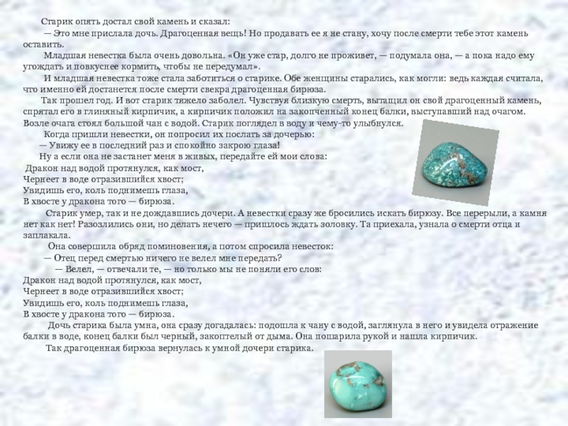 Грустно стало старику: он не мог понять, почему дочь не велела ему продавать этот камень. Он вернулся домой, взглянул на невесток и вдруг его осенило: вот на что пригодится бирюза! «Ну и умница моя дочь!» - подумал про себя старик.