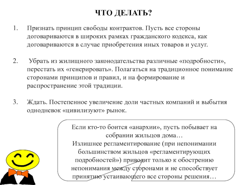 Убрать из жилищного законодательства различные «подробности», перестать их «генерировать». Полагаться на традиционное понимание сторонами принципов и правил, и на формирование и распространение этой традиции.