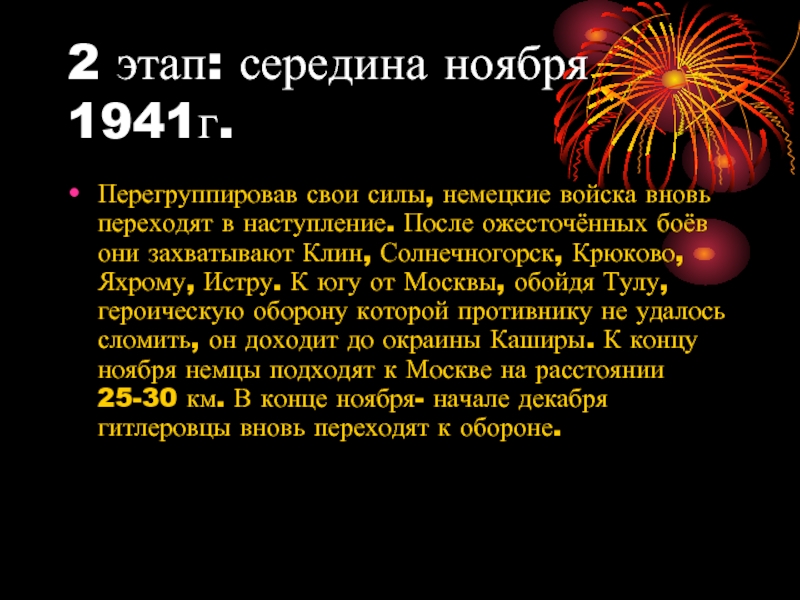 в наступление. После ожесточённых боёв они захватывают Клин, Солнечногорск, Крюково, Яхрому, Истру. К югу от Москвы, обойдя Тулу, героическую оборону которой противнику не удалось сломить, он доходит до окраины Каширы. К концу ноября немцы подходят к Москве на расстоянии 25-30 км. В конце ноября- начале декабря гитлеровцы вновь переходят к обороне.