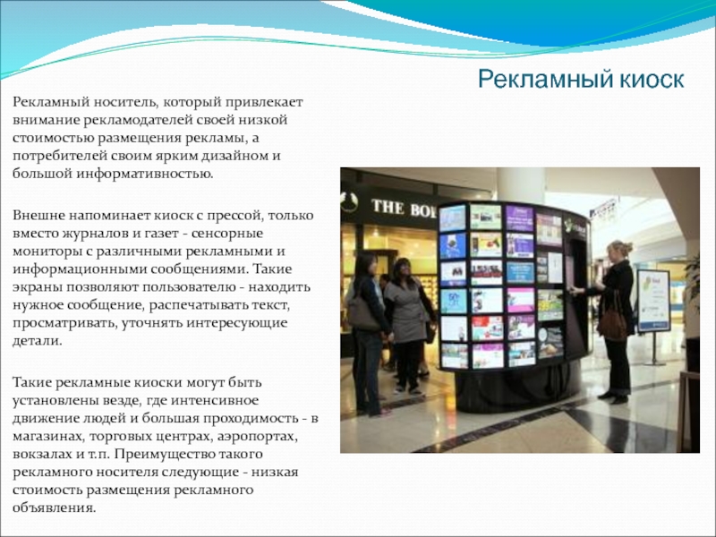 Такие рекламные киоски могут быть установлены везде, где интенсивное движение людей и большая проходимость - в магазинах, торговых центрах, аэропортах, вокзалах и т.п. Преимущество такого рекламного носителя следующие - низкая стоимость размещения рекламного объявления.
