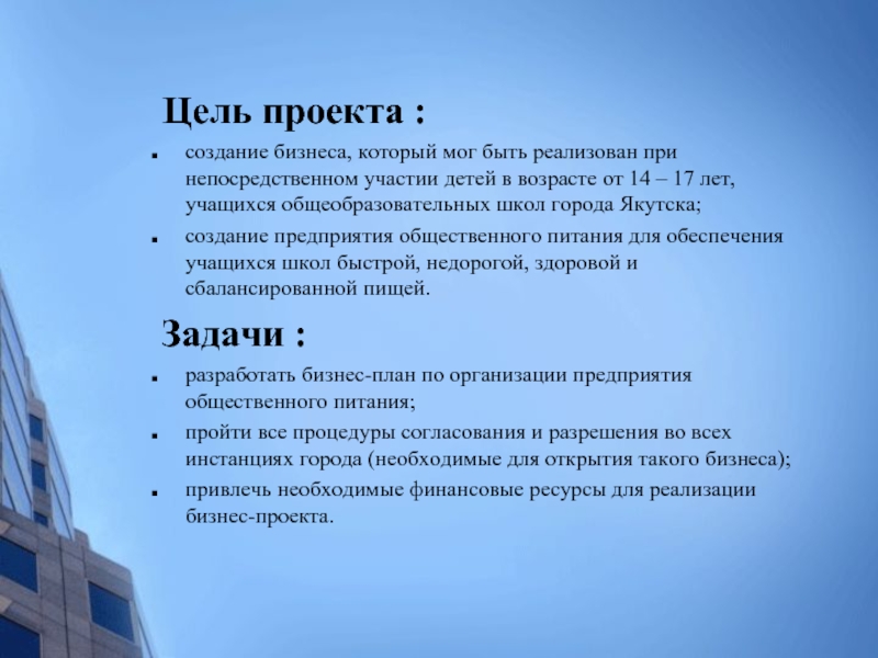 создание предприятия общественного питания для обеспечения учащихся школ быстрой, недорогой, здоровой и сбалансированной пищей.