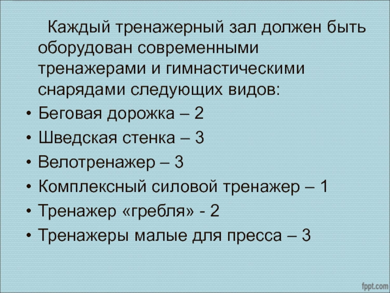 Слайд 8 Каждый тренажерный зал должен быть оборудован современными тренажерами