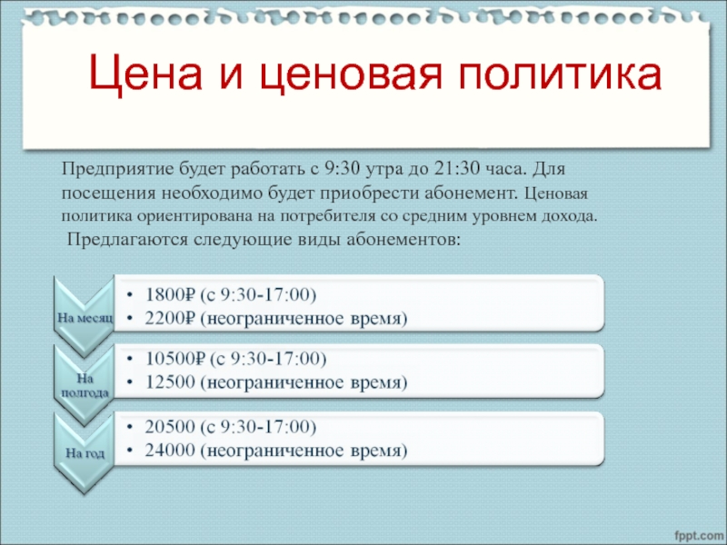часа. Для посещения необходимо будет приобрести абонемент. Ценовая политика ориентирована на потребителя со средним уровнем дохода.