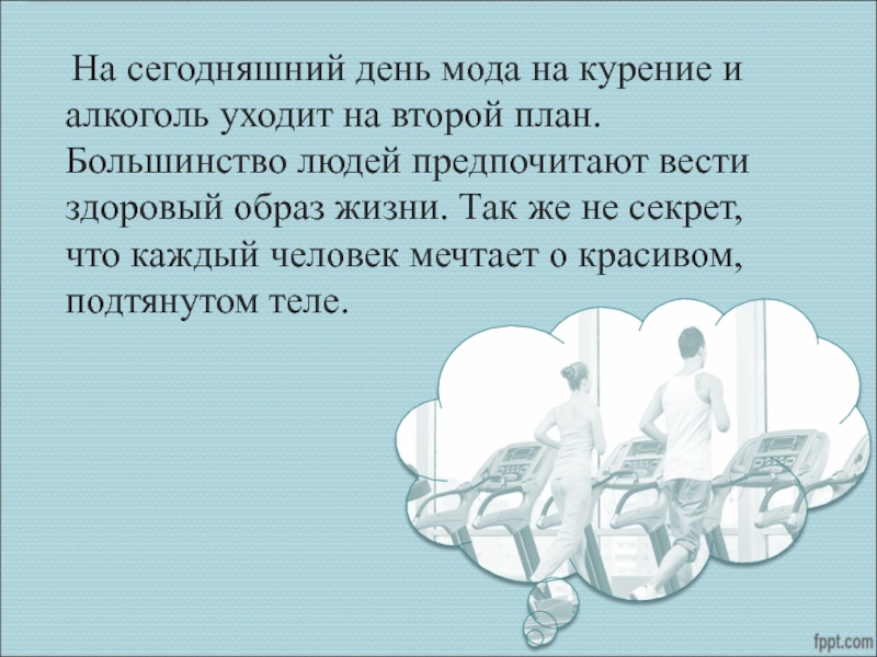 на второй план. Большинство людей предпочитают вести здоровый образ жизни. Так же не секрет, что каждый человек мечтает о красивом, подтянутом теле.