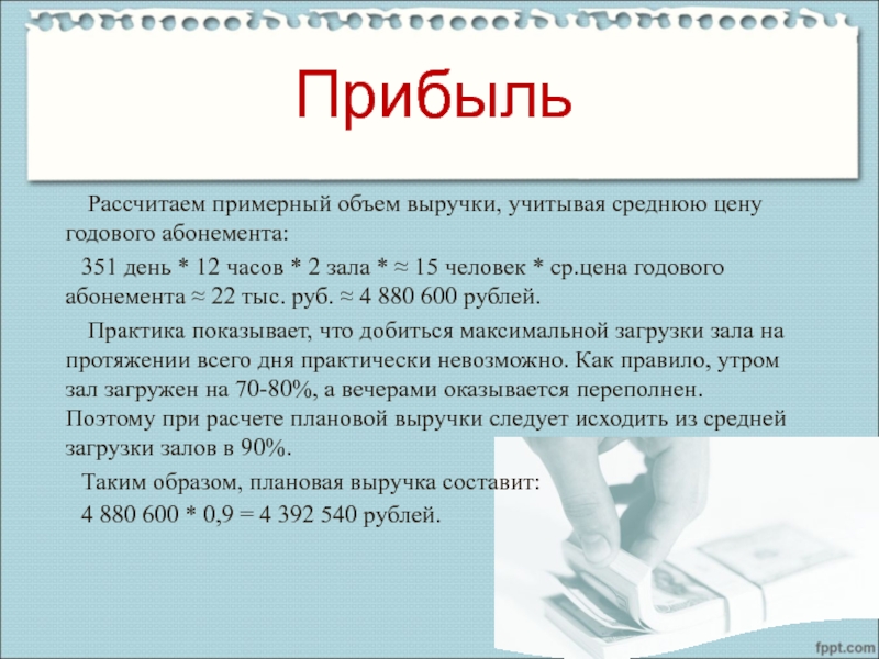 Практика показывает, что добиться максимальной загрузки зала на протяжении всего дня практически невозможно. Как правило, утром зал загружен на 70-80%, а вечерами оказывается переполнен. Поэтому при расчете плановой выручки следует исходить из средней загрузки залов в 90%.
