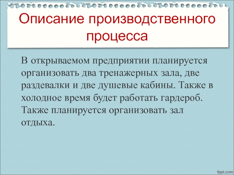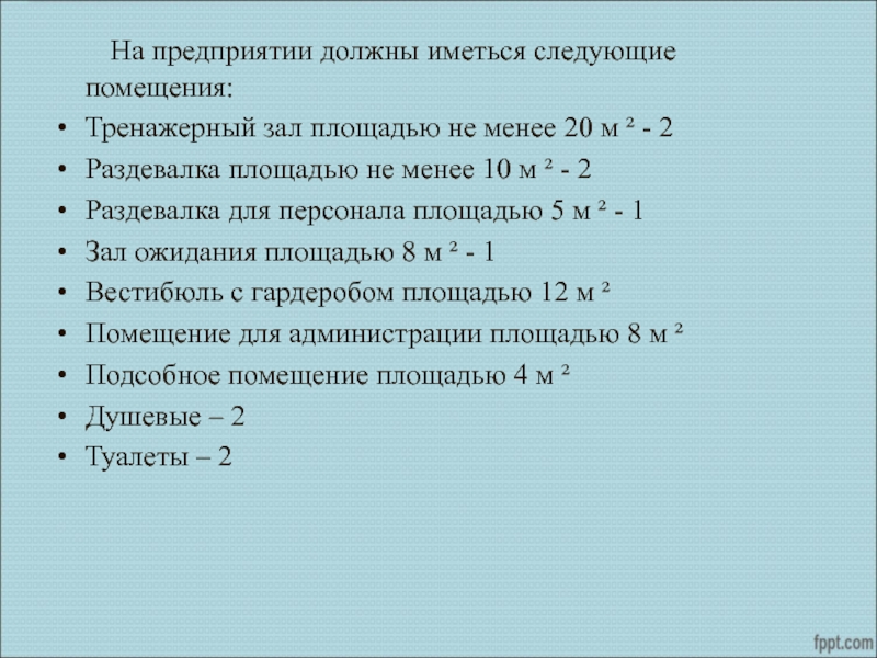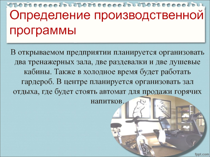Слайд 10В открываемом предприятии планируется организовать два тренажерных зала, две раздевалки и
