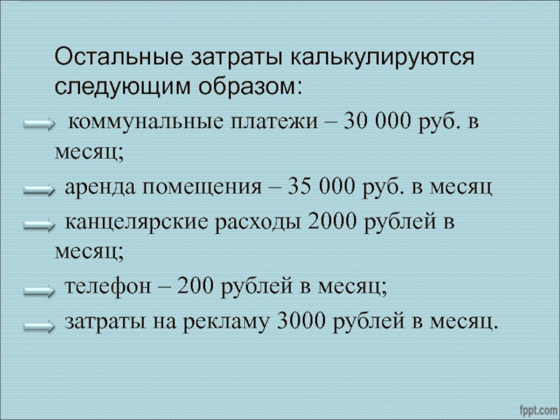 Слайд 16 Остальные затраты калькулируются следующим образом: