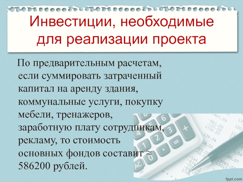 Слайд 11Инвестиции, необходимые для реализации проекта