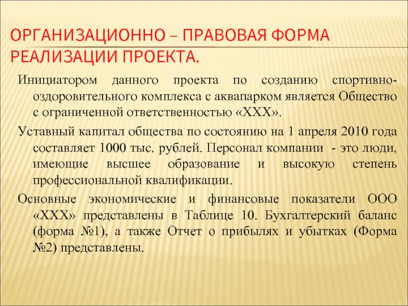 Слайд 12ОРГАНИЗАЦИОННО – ПРАВОВАЯ ФОРМА РЕАЛИЗАЦИИ ПРОЕКТА.