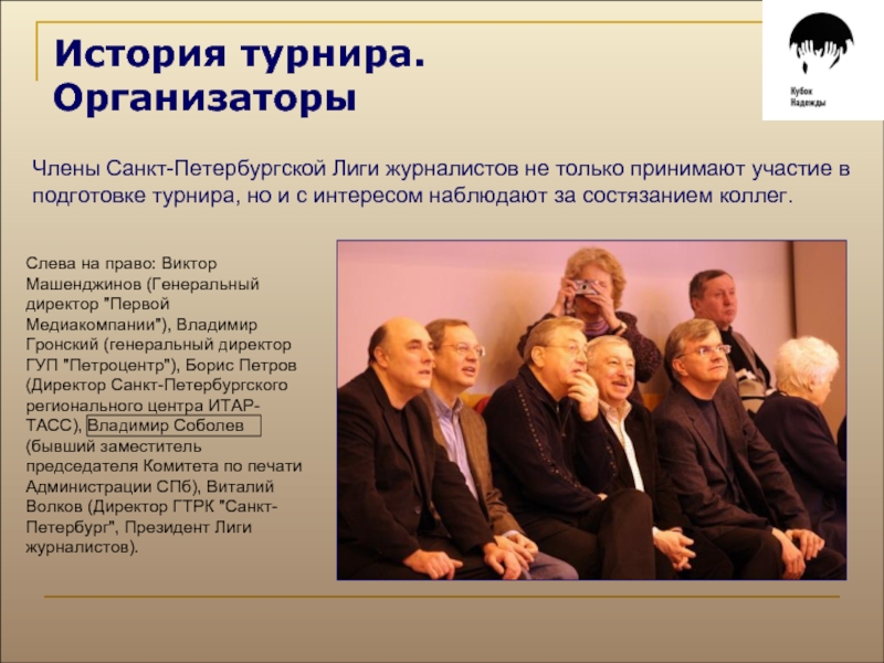 Слева на право: Виктор Машенджинов (Генеральный директор "Первой Медиакомпании"), Владимир Гронский (генеральный директор ГУП "Петроцентр"), Борис Петров (Директор Санкт-Петербургского регионального центра ИТАР-ТАСС), Владимир Соболев (бывший заместитель председателя Комитета по печати Администрации СПб), Виталий Волков (Директор ГТРК "Санкт-Петербург", Президент Лиги журналистов).
