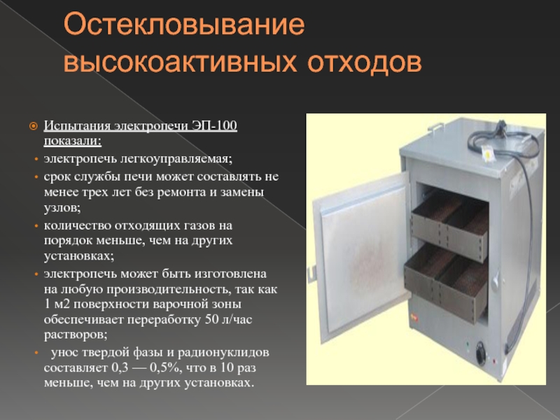 унос твердой фазы и радионуклидов составляет 0,3 — 0,5%, что в 10 раз меньше, чем на других установках.