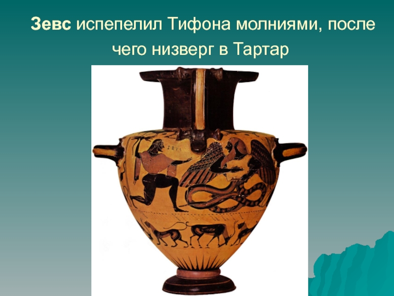 Слайд 19Зевс испепелил Тифона молниями, после чего низверг в Тартар