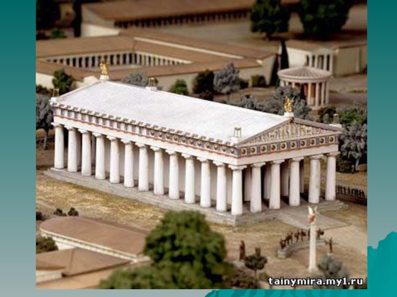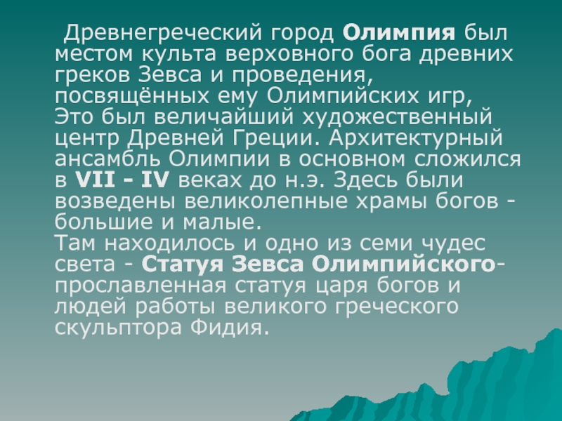 проведения, посвящённых ему Олимпийских игр,  Это был величайший художественный центр Древней Греции. Архитектурный ансамбль Олимпии в основном сложился в VII - IV веках до н.э. Здесь были возведены великолепные храмы богов - большие и малые.  Там находилось и одно из семи чудес света - Статуя Зевса Олимпийского- прославленная статуя царя богов и людей работы великого греческого скульптора Фидия.