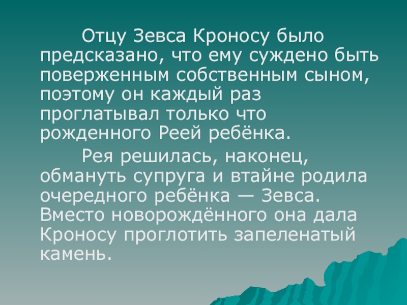 ему суждено быть поверженным собственным сыном, поэтому он каждый раз проглатывал только что рожденного Реей ребёнка.
