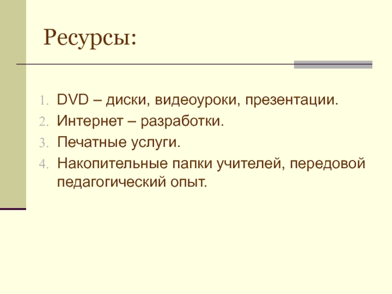 Аппаратные средства ( компьютеры, лазерный принтер, сканер, ксерокс, видеодвойка, видеоплеер, кодоскоп, модем, магнитола, мультимедиа проектор, проигрыватель DVD).