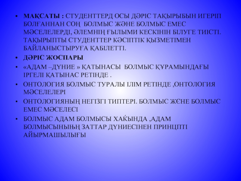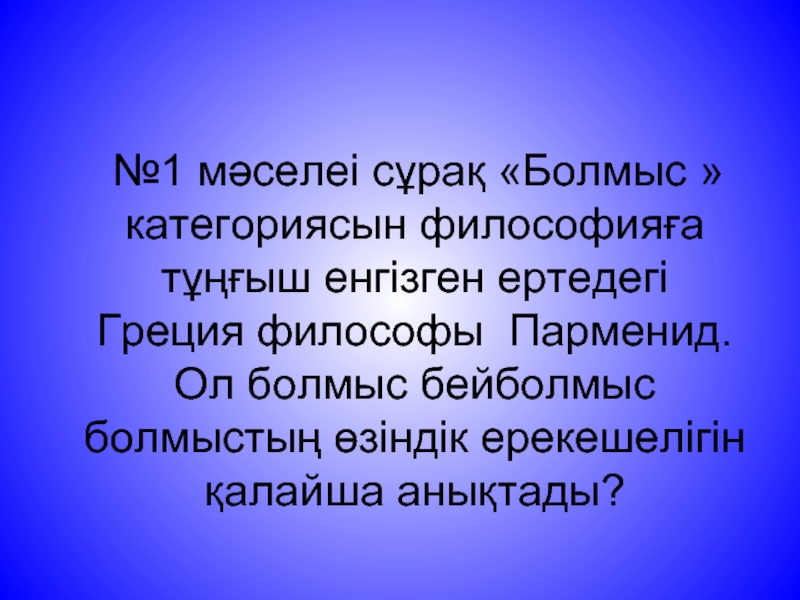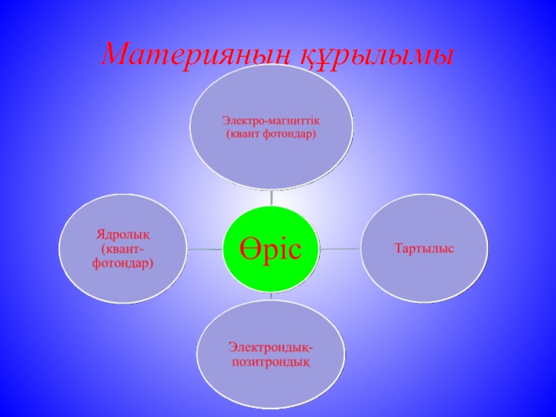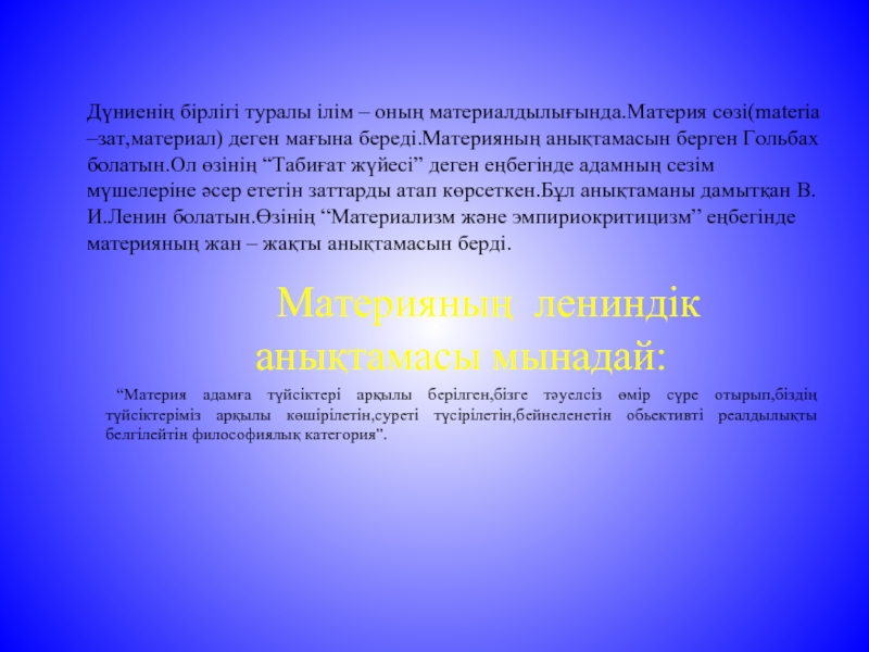 Дүниенің бірлігі туралы ілім – оның материалдылығында.Материя сөзі(materia –зат,материал) деген мағына береді.Материяның анықтамасын берген Гольбах болатын.Ол өзінің “Табиғат жүйесі” деген еңбегінде адамның сезім мүшелеріне әсер ететін заттарды атап көрсеткен.Бұл анықтаманы дамытқан В.И.Ленин болатын.Өзінің “Материализм және эмпириокритицизм” еңбегінде материяның жан – жақты анықтамасын берді.