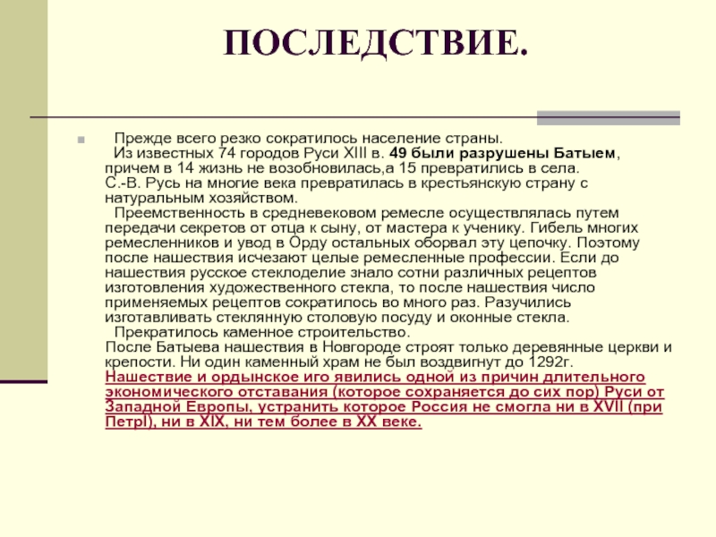 городов Руси XIII в. 49 были разрушены Батыем, причем в 14 жизнь не возобновилась,а 15 превратились в села.