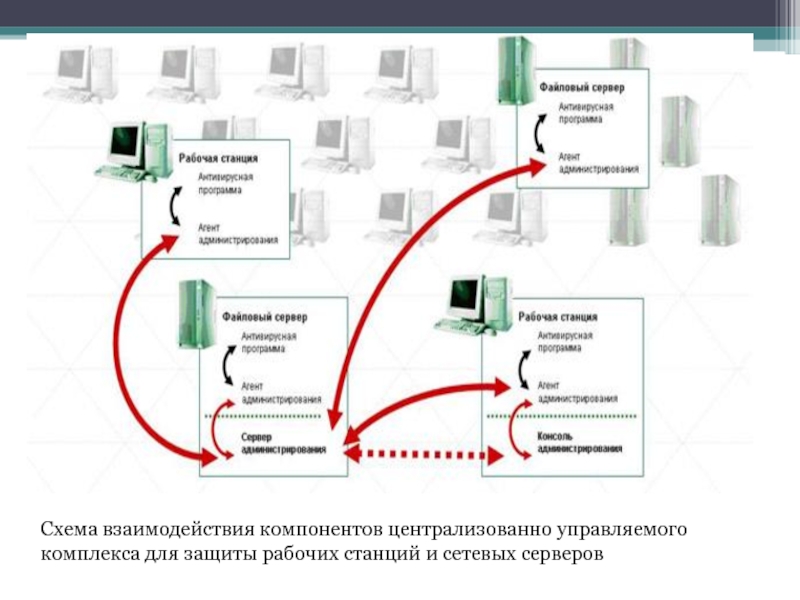 Слайд 12Схема взаимодействия компонентов централизованно управляемого комплекса для защиты рабочих станций и