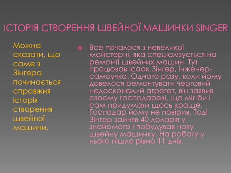 Все почалося з невеликої майстерні, яка спеціалізується на ремонті швейних машин. Тут працював Ісаак Зінгер, інженер-самоучка. Одного разу, коли йому довелося ремонтувати черговий недосконалий агрегат, він заявив своєму господареві, що міг би і сам придумати щось краще. Господар йому не повірив. Тоді Зінгер зайняв 40 доларів у знайомого і побудував нову швейну машинку. На роботу у нього пішло рівно 11 днів.