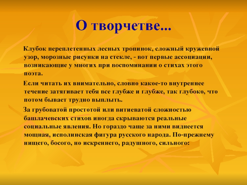 Башлачева с поэзией Серебряного века, но не менее близки ей фольклорные традиции: образы, жанры (былина, частушка),приемы (повтор, рефрен, параллелизм, постоянные эпитеты, устойчивые выражения). Башлачев создает неповторимую атмосферу, которую нельзя описать, ее можно только почувствовать.