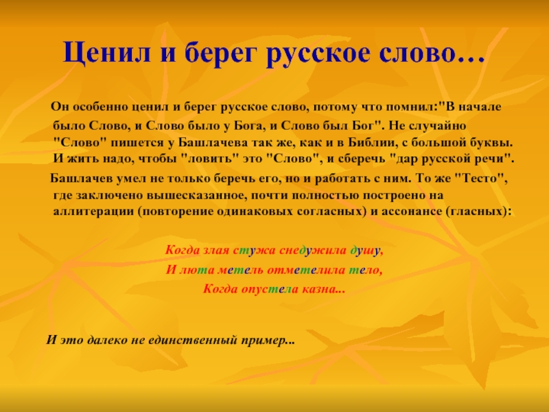 берег русское слово, потому что помнил:"В начале было Слово, и Слово было у Бога, и Слово был Бог". Не случайно "Слово" пишется у Башлачева так же, как и в Библии, с большой буквы. И жить надо, чтобы "ловить" это "Слово", и сберечь "дар русской речи".