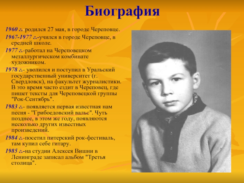 1978 г.- уволился и поступил в Уральский государственный университет (г.Свердловск), на факультет журналистики. В это время часто ездит в Череповец, где пишет тексты для Череповецкой группы "Рок-Сентябрь".