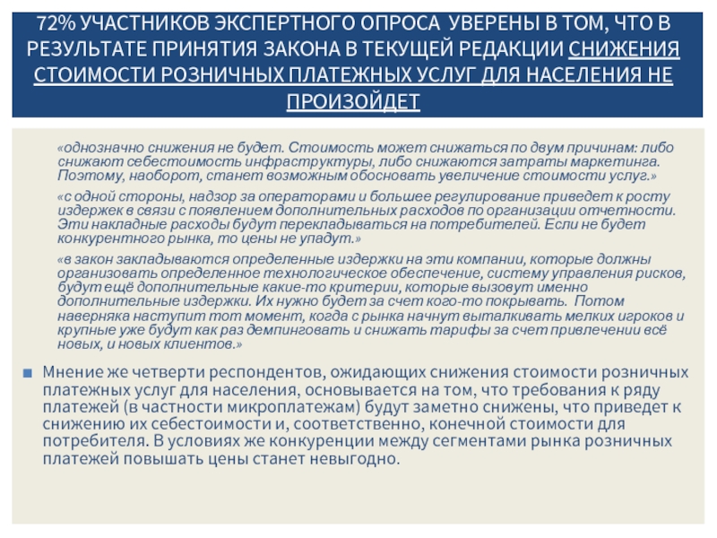 72% УЧАСТНИКОВ ЭКСПЕРТНОГО ОПРОСА УВЕРЕНЫ В ТОМ, ЧТО В РЕЗУЛЬТАТЕ ПРИНЯТИЯ ЗАКОНА В ТЕКУЩЕЙ РЕДАКЦИИ СНИЖЕНИЯ СТОИМОСТИ РОЗНИЧНЫХ ПЛАТЕЖНЫХ УСЛУГ ДЛЯ НАСЕЛЕНИЯ НЕ ПРОИЗОЙДЕТ