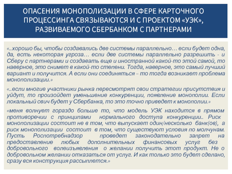ОПАСЕНИЯ МОНОПОЛИЗАЦИИ В СФЕРЕ КАРТОЧНОГО ПРОЦЕССИНГА СВЯЗЫВАЮТСЯ И С ПРОЕКТОМ «УЭК», РАЗВИВАЕМОГО СБЕРБАНКОМ С ПАРТНЕРАМИ