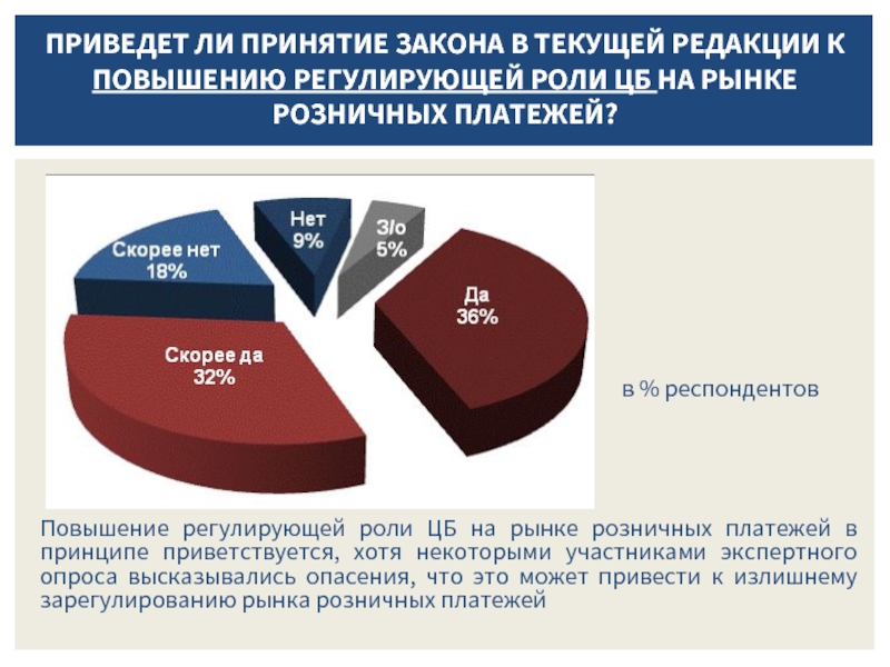 Повышение регулирующей роли ЦБ на рынке розничных платежей в принципе приветствуется, хотя некоторыми участниками экспертного опроса высказывались опасения, что это может привести к излишнему зарегулированию рынка розничных платежей
