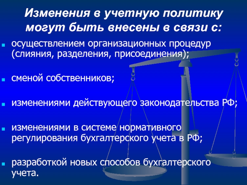 Слайд 23Изменения в учетную политику могут быть внесены в связи с: