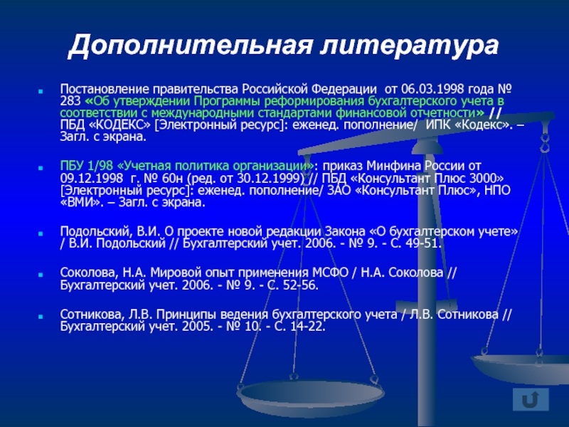 «Об утверждении Программы реформирования бухгалтерского учета в соответствии с международными стандартами финансовой отчетности» // ПБД «КОДЕКС» [Электронный ресурс]: еженед. пополнение/ ИПК «Кодекс». – Загл. с экрана.