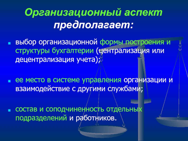 Слайд 22Организационный аспект предполагает:
