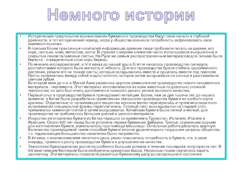 Искусство изготовления бумаги из Китая перешло со временем в Туркестан, Испанию, Италию и Францию. Около 600 лет назад была устроена первая бумажная фабрика. Тряпье, служившее сырьем для изготовления бумаги, измельчалось при помощи мельницы. Остальная работа делалась вручную. Количество производимой таким способом бумаги вполне удовлетворяло тогдашние запросы общества, т.к. подавляющее большинство населения было неграмотно.