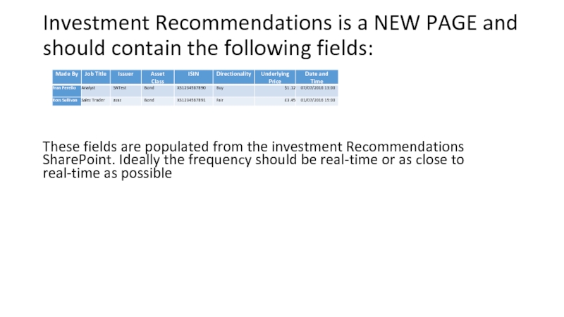 These fields are populated from the investment Recommendations SharePoint. Ideally the frequency should be real-time or as close to real-time as possible
